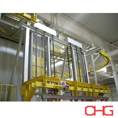 As peças são carregadas manualmente no transportador usando um sistema assistido por elevador. Os cabides param na estação designada, permitindo operações de suspensão seguras e eficientes.