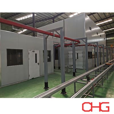 A seção de pré-tratamento utiliza um sistema de transportador de solo tipo skid para transporte estável de componentes pesados de gabinetes, enquanto as seções de pulverização a pó e cura adotam um sistema de transportador aéreo operando em velocidade constante para garantir uniformidade de revestimento e eficiência de produção.